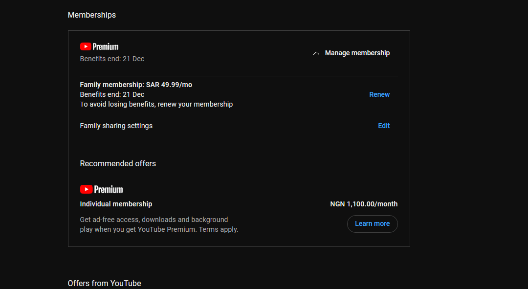 Měl jsem stejný problém na novém účtu, když jsem se pokusil koupit rodinný plán z Indie přes VPN. Ukazovalo pouze individuální a studentský. Tento nový účet nikdy neměl YouTube Premium.