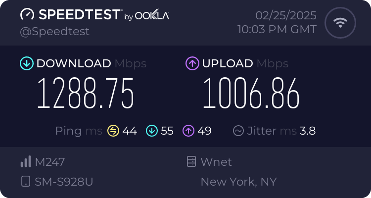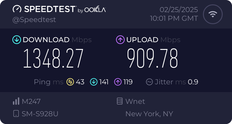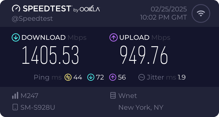 Poslal jsem nějaké podrobnější info na r/Firewalla, ale ve zkratce zde jsou 3 testy rychlosti s Firewalla Gold Pro na 2G/2G fiberovém připojení z jižní Floridy, používající SurfShark na Firewalla VPN klientovi k připojení na NY server SurfShark přes WireGuard. Veškerý provoz na testovaném telefonu běží přes VPN klienta, připojený přes WiFi 7 AP. Všechna ostatní zařízení jsou směrována normálně a vše prochází přes smart Queue FQ_Codel pro tvarování provozu a upload je omezen na 1600 Mbps, aby se kontrolovalo bufferbloat.